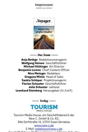 Tourism Media House, ein Geschäftsbereich der New C. GmbH & Co. KG, Alte Dorfstraße 14, 23701 Süsel-Zarnekau www. new-c. de E-Mail: redaktion @ new-c. de Geschäftsführer: Wolfgang Heinen und Florian Schuster