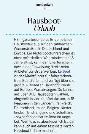 � Ein ganz besonderes Erlebnis ist ein Hausbooturlaub auf den zahlreichen Wasserstraßen in Deutschland und Europa . Ein Motorbootführerschein ist nicht erforderlich . Wer mindestens 18 Jahre alt ist , kann den Charterschein nach einer Einweisung direkt beim Anbieter vor Ort erwerben . Le Boat ist der Marktführer für führerscheinfreie Bootsferien und verfügt über die größte Auswahl an Hausbooturlaub auf Europas Wasserwegen . Du kannst aus über 900 Hausbooten wählen , eingeteilt in vier Komfortklassen , in 18 Regionen in den Ländern Frankreich , Deutschland , Italien , Belgien , Niederlande , Irland , England und Schottland – sogar Kanada hat Le Boat im Angebot . Wem das zu abenteuerlich ist , der kann auch auf einem fest installierten Hausboot Urlaub machen .