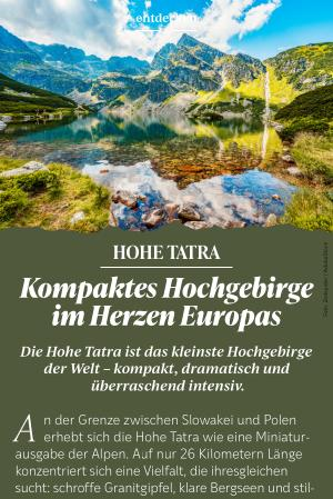 A n der Grenze zwischen Slowakei und Polen erhebt sich die Hohe Tatra wie eine Miniaturausgabe der Alpen. Auf nur 26 Kilometern Länge konzentriert sich eine Vielfalt, die ihresgleichen sucht: schroffe Granitgipfel, klare Bergseen und stille Täler. Der Gerlachovský štít ist mit 2.655 Metern der höchste Gipfel des gesamten Karpatenbogens