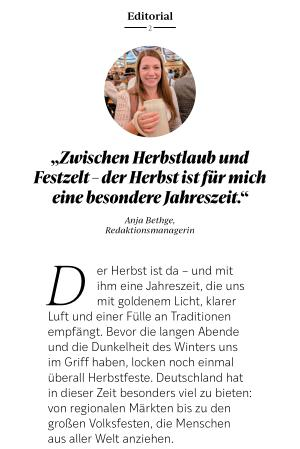 D er Herbst ist da – und mit ihm eine Jahreszeit, die uns mit goldenem Licht, klarer Luft und einer Fülle an Traditionen empfängt. Bevor die langen Abende und die Dunkelheit des Winters uns im Griff haben, locken noch einmal überall Herbstfeste. Deutschland hat in dieser Zeit besonders viel zu bieten: von regionalen Märkten bis zu den großen Volksfesten, die Menschen aus aller Welt anziehen.