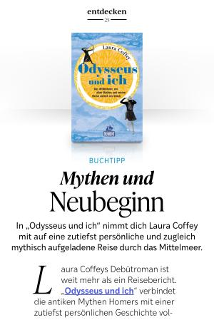 L aura Coffeys Debütroman ist weit mehr als ein Reisebericht. „ Odysseus und ich“ verbindet die antiken Mythen Homers mit einer zutiefst persönlichen Geschichte voller Verlust, Sehnsucht und Hoffnung. Ausgangspunkt ist eine Lebenskrise: eine zerbrochene Beziehung, der pandemische Stillstand und die Krankheit des Vaters. Aus dieser Schwere heraus macht sich die Autorin auf eine moderne Irrfahrt durch die Inselwelt des Mittelmeers.