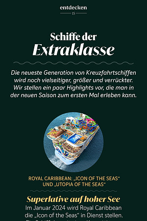Im Januar 2024 wird Royal Caribbean die „ Icon of the Seas “ in Dienst stellen . Ein Schiff das mit einer Kapazität von 7.600 Passagieren nicht nur das größte der Welt sein wird , sondern auch mit beeindruckenden Attraktionen aufwartet . Dazu gehören der größte Wasserpark auf See , der größte Pool auf einem Kreuzfahrtschiff , über 40 Restaurants , ein Skywalk , eine Food Hall und vieles mehr . Im Juli 2024 folgt die etwas kleinere „ Utopia of the Seas “ mit beeindruckenden 17 Wasserrutschen , über 40 Restaurants und Platz für gut 5.600 Passagiere . Beide Schiffe setzen auf umweltfreundlichen Betrieb , indem sie Landstromanschlüsse und Flüssiggasantrieb verwenden .