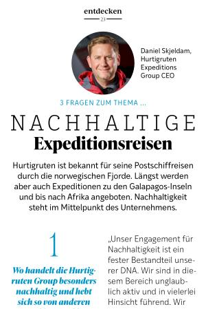 Hurtigruten ist bekannt für seine Postschiffreisen durch die norwegischen Fjorde . Längst werden aber auch Expeditionen zu den Galapagos-Inseln und bis nach Afrika angeboten . Nachhaltigkeit steht im Mittelpunkt des Unternehmens .