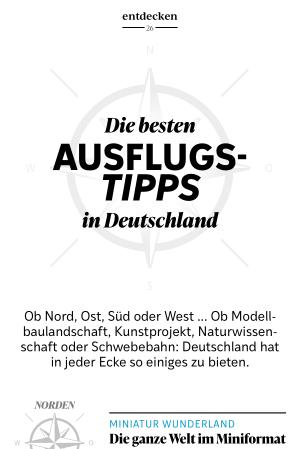 Ob Nord , Ost , Süd oder West ... Ob Modellbaulandschaft , Kunstprojekt , Naturwissenschaft oder Schwebebahn : Deutschland hat in jeder Ecke so einiges zu bieten .