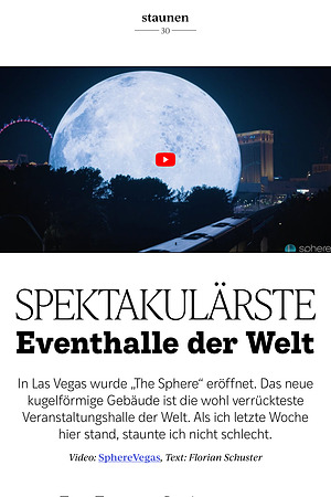 In Las Vegas wurde „ The Sphere “ eröffnet . Das neue kugelförmige Gebäude ist die wohl verrückteste Veranstaltungshalle der Welt . Als ich letzte Woche hier stand , staunte ich nicht schlecht .