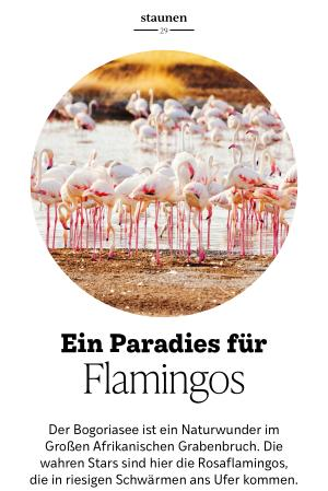 Der Bogoriasee ist ein Naturwunder im Großen Afrikanischen Grabenbruch. Die wahren Stars sind hier die Rosaflamingos, die in riesigen Schwärmen ans Ufer kommen.