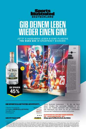 * Enthält 5 Ausgaben Sports Illustrated und 1 Flasche THE DUKE Gin( 0,70 l, 45 % Alkohol) zum Paketpreis von nur 37,50 €. Alle Preise in Euro inklusive der gesetzl. MwSt. sowie inklusive Versandkosten. Angebot und Lieferung nur an Personen über 18 Jahren. Pflichtinformationen gemäß der Lebensmittel-Informationsverordnung sind abrufbar unter shop. sportsillustrated. de / duke. Sie haben ein gesetzl. Widerrufsrecht. Die Belehrung können Sie unter shop. sportsillustrated. de / abg abrufen. Verantwortlicher und Kontakt: Kouneli Sports Media GmbH, Kaiser-Ludwig-Platz 5, 80336 München, Amtsgericht München, HRB 269489. ** Ortsüblicher Tarif.
