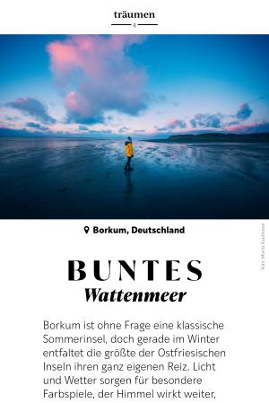 Borkum ist ohne Frage eine klassische Sommerinsel, doch gerade im Winter entfaltet die größte der Ostfriesischen Inseln ihren ganz eigenen Reiz. Licht und Wetter sorgen für besondere Farbspiele, der Himmel wirkt weiter, das Meer wilder, die Atmosphäre klar und intensiv. Mitten im UNESCO-Weltnaturerbe Wattenmeer gelegen, beeindruckt Borkum mit weiten Stränden: Die gesunde Nordseeluft und der scheinbar endlose Horizont machen den Aufenthalt zu einem unmittelbaren Naturerlebnis. Wer Ruhe sucht, Zeit für sich braucht und einfach mal durchatmen will, findet hier den richtigen Ort. Schon ein ausgedehnter Strandspaziergang lässt die wohltuende Wirkung der salzigen Luft spürbar werden. Für aufwärmende Wohlfühlmomente sorgt das Gezeitenland mit Schwimmbad, Saunen und einem großzügigen Wellnessbereich.