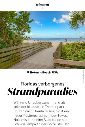 Während Urlauber zunehmend abseits der klassischen Themenpark- Routen nach Florida reisen, rückt ein neues Küstenparadies in den Fokus: Nokomis, rund eine Autostunde südlich von Tampa an der Golfküste. Der kleine Badeort im Sarasota County gilt noch immer als Geheimtipp: kristallklares, türkisfarbenes Wasser, feiner weißer Sand und entspannte Surfbedingungen ohne große Menschenmengen. Sanfte Dünungen aus dem Golf von Mexiko sorgen für beständige Wellen, ideal für Anfänger wie für Fortgeschrittene. Die Atmosphäre ist gelassen: Surfer, Stand-up- Paddler und Strandbesucher teilen sich die Küste in einer Gemeinschaft, die Einfachheit und die Verbundenheit mit dem Meer schätzt.