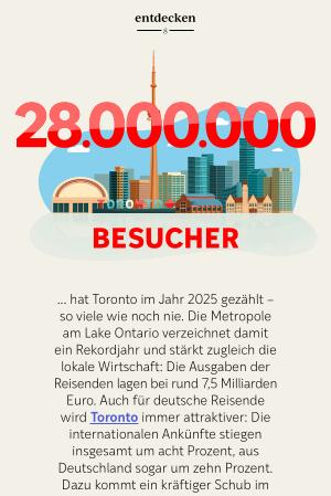 ... hat Toronto im Jahr 2025 gezählt – so viele wie noch nie. Die Metropole am Lake Ontario verzeichnet damit ein Rekordjahr und stärkt zugleich die lokale Wirtschaft: Die Ausgaben der Reisenden lagen bei rund 7,5 Milliarden Euro. Auch für deutsche Reisende wird Toronto immer attraktiver: Die internationalen Ankünfte stiegen insgesamt um acht Prozent, aus Deutschland sogar um zehn Prozent. Dazu kommt ein kräftiger Schub im Business-Bereich – mit 74 großen mehrtägigen Veranstaltungen mit jeweils über 1.000 Teilnehmern. Toronto zeigt damit eindrucksvoll, wie stark Freizeit- und Geschäftsreisen die Dynamik einer Stadt antreiben können.