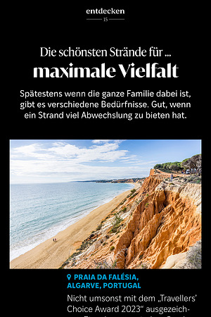 Nicht umsonst mit dem „ Travellers ’ Choice Award 2023 “ ausgezeichnet : Eingebettet zwischen Sandsteinfelsen , die in verschiedenen Rot- und Orangetönen leuchten , erstreckt sich an der Algarve ein langer Streifen feinsten Sands , die Praia da Falésia . Aktivurlauber können Sportarten wie Surfen und Stand-up-Paddling nachgehen . Die nahegelegenen Pinienwälder sind ein Paradies für Wanderer und Naturbegeisterte – und auch das quirlige Albufeira ist nicht weit .