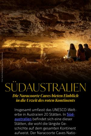 Insgesamt umfasst das UNESCO-Welterbe in Australien 20 Stätten. In Südaustralien befindet sich eine dieser Stätten, die wohl die längste Geschichte auf dem gesamten Kontinent aufweist. Der Naracoorte Caves National Park an der Limestone Coast ist Teil der „ Australian Fossil Mammal Sites” und gewährt Einblicke in die Welt der längst ausgestorbenen Megafauna. Über einen Zeitraum von mehr als einer halben Million Jahren sammelten sich in den Kalksteinhöhlen die Knochen von Tieren, die in die Spalten fielen oder darin verendeten. Darunter finden sich spektakuläre Funde wie Riesen-Kängurus, urzeitliche Wombats und der faszinierende Beutellöwe( Thylacoleo carnifex).