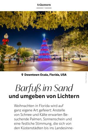 Weihnachten in Florida wird auf ganz eigene Art gefeiert: Anstelle von Schnee und Kälte erwarten Besuchende Palmen, Sonnenschein und eine festliche Stimmung, die sich von den Küstenstädten bis ins Landesinnere zieht. Lichterglanz, Musik und kreative Veranstaltungen schaffen eine besondere Atmosphäre, die den Zauber der Feiertage mit dem entspannten Lebensgefühl des „ Sunshine State“ verbindet. Ob am Strand, auf dem Wasser oder in den lebendigen Innenstädten von Ocala, Panama City, St. Pete-Clearwater oder Jacksonville – überall entstehen unvergessliche Momente, die die Vorweihnachtszeit in Florida so einzigartig machen. Vielleicht ist es ja sogar eine Inspiration, Weihnachten im nächsten Jahr dort zu verbringen.