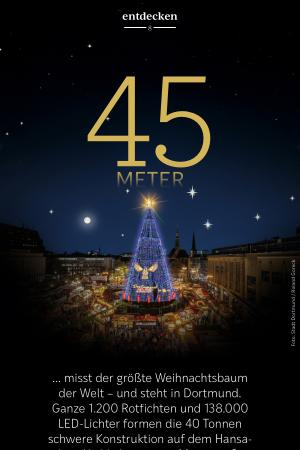 ... misst der größte Weihnachtsbaum der Welt – und steht in Dortmund. Ganze 1.200 Rotfichten und 138.000 LED-Lichter formen die 40 Tonnen schwere Konstruktion auf dem Hansaplatz. Highlight: ein vier Meter großer Engel mit beweglichen Flügeln an der Spitze des Giganten. Ein Rekordbaum, der nicht nur hell, sondern auch himmlisch strahlt.