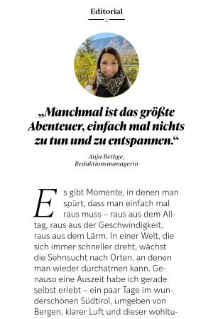 E s gibt Momente, in denen man spürt, dass man einfach mal raus muss – raus aus dem Alltag, raus aus der Geschwindigkeit, raus aus dem Lärm. In einer Welt, die sich immer schneller dreht, wächst die Sehnsucht nach Orten, an denen man wieder durchatmen kann. Genauso eine Auszeit habe ich gerade selbst erlebt – ein paar Tage im wunderschönen Südtirol, umgeben von Bergen, klarer Luft und dieser wohltuenden Stille, die einen ganz von selbst zur Ruhe kommen lässt. Dazu aber mehr in der nächsten Ausgabe. In dieser widmen wir uns den besonderen Orten in Deutschland, an denen man Kraft tanken, abschalten und sich wieder auf das Wesentliche besinnen kann – egal ob bei einem Wochenendausflug, einer kleinen Reise oder einem spontanen Tag in der Natur.