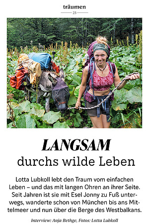 Lotta Lubkoll lebt den Traum vom einfachen Leben – und das mit langen Ohren an ihrer Seite. Seit Jahren ist sie mit Esel Jonny zu Fuß unterwegs, wanderte schon von München bis ans Mittelmeer und nun über die Berge des Westbalkans.