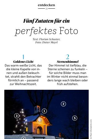 1 Goldenes Licht Das warm-weiße Licht , das die kleine Kapelle von innen und außen beleuchtet , strahlt den Betrachter förmlich an – passend zur Weihnachtszeit .