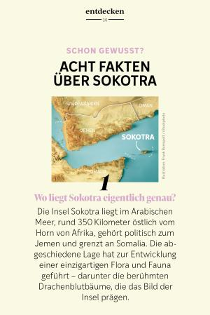 Die Insel Sokotra liegt im Arabischen Meer, rund 350 Kilometer östlich vom Horn von Afrika, gehört politisch zum Jemen und grenzt an Somalia. Die abgeschiedene Lage hat zur Entwicklung einer einzigartigen Flora und Fauna geführt – darunter die berühmten Drachenblutbäume, die das Bild der Insel prägen.