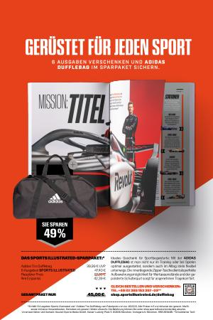 * Enthält 6 Ausgaben Sports Illustrated und 1 Adidas Tiro Dufflebag zum Paketpreis von nur 45,00 €. Alle Preise in Euro inklusive der gesetzl. MwSt. sowie inklusive Versandkosten. Sie haben ein gesetzl. Widerrufsrecht. Die Belehrung können Sie unter shop. sportsillustrated. de / abg abrufen. Verantwortlicher und Kontakt: Kouneli Sports Media GmbH, Kaiser-Ludwig-Platz 5, 80336 München, Amtsgericht München, HRB 269489. ** Ortsüblicher Tarif.