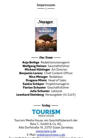 Tourism Media House, ein Geschäftsbereich der New C. GmbH & Co. KG, Alte Dorfstraße 14, 23701 Süsel-Zarnekau www. new-c. de E-Mail: redaktion @ new-c. de Geschäftsführer: Wolfgang Heinen und Florian Schuster