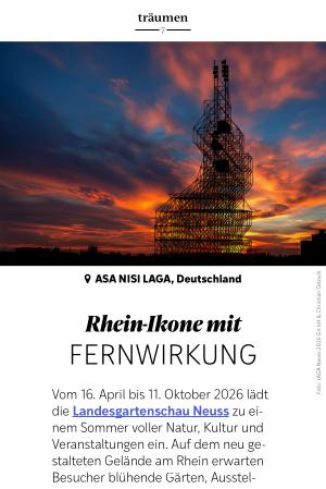 die Landesgartenschau Neuss zu einem Sommer voller Natur, Kultur und Veranstaltungen ein. Auf dem neu gestalteten Gelände am Rhein erwarten Besucher blühende Gärten, Ausstellungen und ein abwechslungsreiches Programm für alle Sinne – begleitet von rheinischer Gastfreundschaft. Besonders auffällig ist die Verbindung von Gartenkunst und zeitgenössischer Kunst. Drei große, ortsspezifische Installationen setzen markante Akzente im Gelände und schaffen eindrucksvolle Fotomotive. Zu den spektakulärsten Werken gehört „ ASA NISI LAGA“ des Düsseldorfer Künstlers Christian Odzuck. Die rund 30 Meter hohe, begehbare Skulptur ist sogar bis nach Düsseldorf sichtbar. Auf etwa zehn Metern Höhe bietet eine Aussichtsplattform einen besonderen Blick über den Rhein und das Gartenschaugelände.