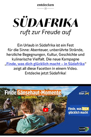 Ein Urlaub in Südafrika ist ein Fest für die Sinne: Abenteuer, unberührte Strände, herzliche Begegnungen, Kultur, Geschichte und kulinarische Vielfalt. Die neue Kampagne „ Finde, was dich glücklich macht – in Südafrika“ zeigt all diese Facetten in einem Video. Entdecke jetzt Südafrika!