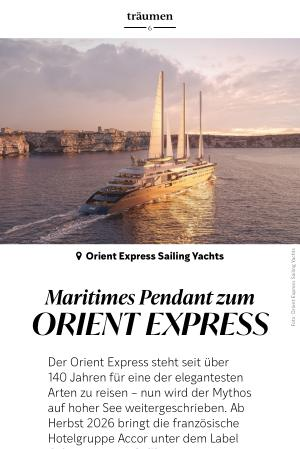 Der Orient Express steht seit über 140 Jahren für eine der elegantesten Arten zu reisen – nun wird der Mythos auf hoher See weitergeschrieben. Ab Herbst 2026 bringt die französische Hotelgruppe Accor unter dem Label Orient Express Sailing Yachts zwei exklusive Großsegler auf die Weltmeere: die Orient Express Corinthian und ab 2027 die Orient Express Silencieux Olympian. Damit entsteht ein neues Kapitel luxuriösen Reisens – entschleunigt, stilvoll und mit unverwechselbarem Flair. Luxury Travel aus Bornheim zählt zu den ersten Partnern im deutschsprachigen Raum und bietet ab sofort maßgeschneiderte Reisen auf den neuen Segelyachten an.
