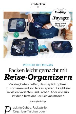P acking Cubes , Packwürfel , Organizer-Taschen oder wie auch immer man sie nennen will : Ich bin totaler Fan ! Denn sie sorgen auf Reisen für mehr Ordnung in meinem Koffer . Die kleinen , rechteckigen Taschen wurden speziell für das Verstauen von Kleidung , Accessoires und anderen Gegenständen entwickelt . Sie unterstützen mich dabei , meine Sachen strukturiert zu verstauen , was Zeit und Platz spart – und vor allem finde ich meine Sachen schnell wieder . Durch Zufall bin ich auf der Suche nach einem Geburtstagsgeschenk für meine Tochter auf moses gestoßen . Der Onlineshop bietet eine ganze Erlebniswelt „ Fernweh “, in der es viele Produkte für Reiselustige gibt . Von Hängematten über Nackenkissen bis hin zur Mini-LED- Taschenlampe . Und hier habe ich es gefunden : das 3er-Set Fernweh Reise-Organizer- Täschchen . Und das auch noch im Sale für nur 11,50 Euro .