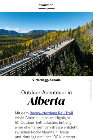 Mit dem Rocky – Nordegg Rail Trail erhält Alberta ein neues Highlight für Outdoor-Enthusiasten. Entlang einer ehemaligen Bahntrasse entsteht zwischen Rocky Mountain House und Nordegg ein über 100 Kilometer langes Trailnetz, das Naturerlebnis, Freizeitaktivitäten und regionale Geschichte miteinander verbindet. Der vielseitig nutzbare Weg führt durch Flusstäler, Wälder und offene Landschaften und richtet sich an Wanderer, Radfahrer, Reiter sowie Winter- und Motorsportunternehmungen. Rund 50 Kilometer sind bereits geöffnet, weitere Etappen werden in den kommenden Jahren schrittweise realisiert. So entsteht in Clearwater County eines der vielseitigsten Trailangebote Westkanadas.