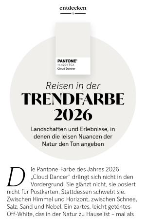 D ie Pantone-Farbe des Jahres 2026 „ Cloud Dancer“ drängt sich nicht in den Vordergrund. Sie glänzt nicht, sie posiert nicht für Postkarten. Stattdessen schwebt sie. Zwischen Himmel und Horizont, zwischen Schnee, Salz, Sand und Nebel. Ein zartes, leicht getöntes Off-White, das in der Natur zu Hause ist – mal als winterliches Licht, mal als Wolkenschleier, mal als fast unwirkliche Weite. Als Farbton steht sie für Gelassenheit, Ruhe und Entspannung und den Raum für Neues. Eine Farbe, die weniger behauptet als andeutet – und gerade deshalb zum Reisen einlädt. Cloud Dancer spiegelt sich in Landschaften und Orten wider, in denen der Blick weiter wird und das Tempo automatisch langsamer.