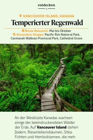 An der Westküste Kanadas wachsen einige der beeindruckendsten Wälder der Erde. Auf Vancouver Island stehen Zedern, Riesenlebensbäumen, Sitka- Fichten und Hemlocktannen, die mehrere Jahrhunderte alt sind und Höhen von über 90 Metern erreichen können. In Regionen wie dem Pacific Rim National Park Reserve oder dem Carmanah Walbran Provincial Park wirken diese Wälder beinahe kathedralenartig: Stämme mit mehreren Metern Durchmesser ragen aus einem dichten Teppich aus Moosen und Farnen, während Nebel vom Pazifik durch die Baumkronen zieht.