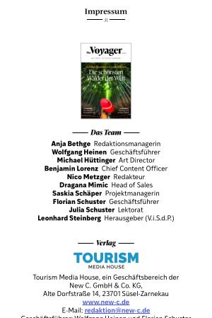 Tourism Media House, ein Geschäftsbereich der New C. GmbH & Co. KG, Alte Dorfstraße 14, 23701 Süsel-Zarnekau www. new-c. de E-Mail: redaktion @ new-c. de Geschäftsführer: Wolfgang Heinen und Florian Schuster