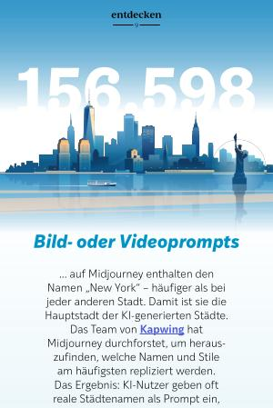 ... auf Midjourney enthalten den Namen „ New York“ – häufiger als bei jeder anderen Stadt. Damit ist sie die Hauptstadt der KI-generierten Städte. Das Team von Kapwing hat Midjourney durchforstet, um herauszufinden, welche Namen und Stile am häufigsten repliziert werden. Das Ergebnis: KI-Nutzer geben oft reale Städtenamen als Prompt ein, um imaginäre Bilder dieser Orte zu erzeugen – oder um einen anderen Prompt mit dem Zusatz „ mehr wie New York“ anzupassen. Das könnte daran liegen, dass New Yorks Bild als archetypische Stadt durch seine häufige Darstellung in Filmen verstärkt wird: als Stadt des Verbrechens, der Liebe, der Politik oder der Alltagsgeschichten.