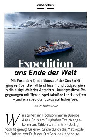 Mit Poseidon Expeditions auf der Sea Spirit ging es über die Falkland Inseln und Südgeorgien in die eisige Welt der Antarktis. Unvergessliche Begegnungen mit Tieren, spektakuläre Landschaften – und ein absoluter Luxus auf hoher See.