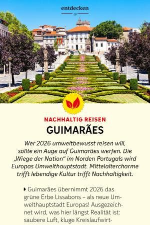 Musik- und Kunstfestivals auf Straßen und Plätzen gefeiert, im November steht alles im Zeichen des Jazz. Und wer zur Weihnachtszeit kommt, erlebt Lichterglanz und ganz viel Gemeinschaftsgefühl. Die Lage? Ideal für einen kleinen Roadtrip, denn Guimarães liegt rund 50 km nordöstlich von Porto. Ganz in der Nähe warten der Wallfahrtsort São Bento da Porta Aberta und Portugals einziger Nationalpark Peneda-Gerês – perfekt für alle, die urbane Nachhaltigkeit mit Naturerlebnis verbinden wollen.