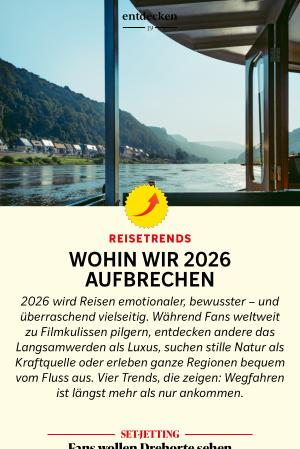 2026 wird Reisen emotionaler, bewusster – und überraschend vielseitig. Während Fans weltweit zu Filmkulissen pilgern, entdecken andere das Langsamwerden als Luxus, suchen stille Natur als Kraftquelle oder erleben ganze Regionen bequem vom Fluss aus. Vier Trends, die zeigen: Wegfahren ist längst mehr als nur ankommen.