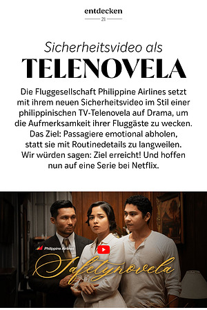 Die Fluggesellschaft Philippine Airlines setzt mit ihrem neuen Sicherheitsvideo im Stil einer philippinischen TV-Telenovela auf Drama, um die Aufmerksamkeit ihrer Fluggäste zu wecken. Das Ziel: Passagiere emotional abholen, statt sie mit Routinedetails zu langweilen. Wir würden sagen: Ziel erreicht! Und hoffen nun auf eine Serie bei Netflix.