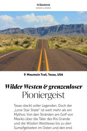 Texas steckt voller Legenden. Doch der „ Lone Star State“ ist weit mehr als ein Mythos: Von den Stränden am Golf von Mexiko über die Täler des Rio Grande und die Wüsten Westtexas bis zu den Sumpfgebieten im Osten und den endlosen Prärien zeigt sich der Bundesstaat überraschend vielfältig. Moderne Metropolen wie Austin, Dallas, Houston und San Antonio treffen auf Ursprünglichkeit, Tradition auf Innovation. Ob Familien, Abenteurer oder Genießer – Texas bietet für jede Entdeckungslust das passende Erlebnis.