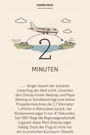 ... – länger dauert der kürzeste Linienflug der Welt nicht. Zwischen den Orkney-Inseln Westray und Papa Westray in Schottland legt eine kleine Propellermaschine die 2,7 Kilometer Luftlinie in Rekordzeit zurück, bei Rückenwind sogar in nur 47 Sekunden. Seit 1967 fliegt die Regionalgesellschaft Loganair diese Mini-Strecke regelmäßig. Doch der Flug ist nicht nur ein touristisches Kuriosum: Obwohl er bei Reisenden beliebt ist, gehört er für viele Einheimische zum Alltag. Lehrkräfte, medizinisches Personal, Polizisten und Studierende pendeln im Acht sitzer zwischen den Inseln – so selbstverständlich wie andere morgens Bus oder Bahn nehmen.