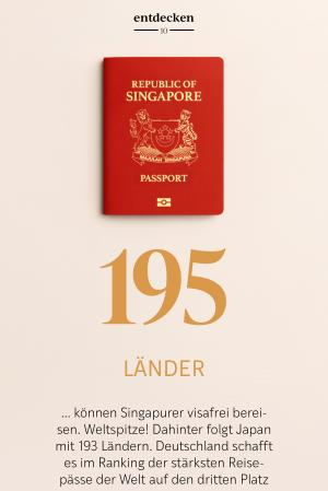 ... können Singapurer visafrei bereisen. Weltspitze! Dahinter folgt Japan mit 193 Ländern. Deutschland schafft es im Ranking der stärksten Reisepässe der Welt auf den dritten Platz zusammen mit Frankreich, Italien, Spanien, Finnland und Südkorea mit 192 Ländern. Schlusslicht ist Afghanistan mit 26 Ländern. Übrigens: In Deutschland besteht keine gesetzliche Verpflichtung, einen Reisepass zu besitzen. Aber ein Reisepass bringt klare Vorteile mit sich, er erleichtert die Beantragung von Visa und ermöglicht spontane Reisen in Länder, die für deutsche Staatsbürger: innen visumfrei zugänglich sind. Es lohnt sich also, rechtzeitig einen Reisepass zu beantragen oder dessen Gültigkeit zu prüfen – auch wenn man noch keine Reisepläne hat.