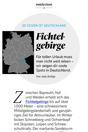 Z wischen Bayreuth, Hof und Weiden erhebt sich das Fichtelgebirge bis auf über 1.000 Meter – eine schneesichere Mittelgebirgslandschaft und ganzjähriges Ziel für Aktivurlauber. Im Winter locken Schneeberg und Ochsenkopf mit Skipisten, Loipen und Schneeschuhtrails. Der markante Sendeturm auf dem Ochsenkopf ist mit 177 Metern nicht nur ein technisches Wahrzeichen, sondern auch ein hervorragender Aussichtspunkt.