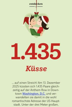 ... auf einen Streich! Am 13. Dezember 2025 küssten sich 1.435 Paare gleichzeitig auf der Anthem Row in Downtown Washington, D. C. und verwandelten sie damit in die wohl romantischste Adresse der US-Hauptstadt. Unter der drei Meter großen, schwebenden Kugel aus Mistelzweigen, dem traditionellen „ National Mistletoe”, küssten sich die Paare fünf Sekunden lang und stellten damit einen neuen Guinness-Weltrekord auf. Rund um diesen großen Moment wurde mit Musik, Essen und Getränken sowie weiteren Fotoaktionen und jeder Menge guter Laune gefeiert.