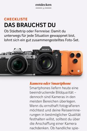 Kamera oder Smartphone Smartphones liefern heute eine beeindruckende Bildqualität – dennoch sind Kameras in den meisten Bereichen überlegen. Wenn du ernsthaft fotografieren möchtest und deine Reiseerinnerungen in bestmöglicher Qualität festhalten willst, solltest du über die Anschaffung einer Kamera nachdenken. Ob handliche spiegellose Modelle oder hochwertiges Profi-Equipment: Das Angebot ist groß und richtet sich vor allem nach deinen persönlichen Vorlieben und deinem Budget.