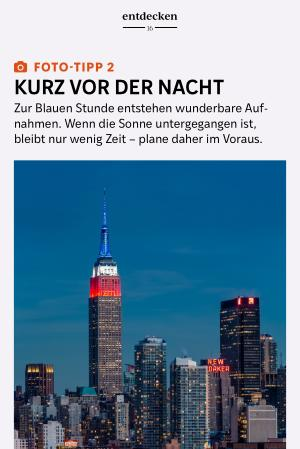Bei der Fotografie dreht sich alles um das perfekte Licht. Und dieses gibt es meist nur zweimal am Tag – beim Sonnenaufgang und beim Sonnenuntergang. Im schönen, weichen Licht der Dämmerung wirken berühmte Wahrzeichen wie das Empire State Building noch eindrucksvoller. Plane deine Fototour deshalb so, dass du kurz vor Sonnenuntergang am idealen Aufnahmepunkt bist, um das Motiv in der magischen Stimmung der sogenannten Blauen Stunde festzuhalten. Etwa 30 Minuten nach Sonnenuntergang ist die Atmosphäre besonders schön: Der Himmel taucht in ein tiefes Dunkelblau, während die Lichter der Stadt beginnen zu glühen. Unter diesen Bedingungen solltest du möglichst mit einem Stativ fotografieren. Da der Verschluss eine ganze Sekunde oder sogar länger geöffnet bleibt, entstehen sonst schnell verwackelte Aufnahmen.