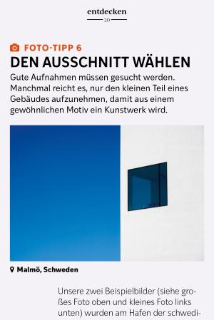 Dieses moderne Gebäude hat eine sehr klare, komplett weiße Fassade, die nur von einem besonders großen Fenster unterbrochen wird – einem Fenster, durch das man sicher einen großartigen Blick über die Ostsee hat. Die beiden Fotos zeigen, worauf es beim Fotografieren wirklich ankommt: auf das richtige Sehen. Wer eine Runde um den Hafen dreht, entdeckt dieses Fenster ebenfalls. Dann gilt es nur noch, das passende Objektiv zu wählen( hier: ein Telezoom) und den richtigen Ausschnitt zu finden. Schon wird aus einem eher unspektakulären Motiv eine abstrakte Schönheit. Ein solches Bild zieht Aufmerksamkeit auf sich. Die klare Linie der weißen Hauswand teilt das Foto im letzten Drittel und sorgt dafür, dass die Aufnahme nicht zu harmonisch – oder anders gesagt: nicht langweilig – wirkt. Wer besondere Fotos machen möchte, sollte um die Ecke denken.