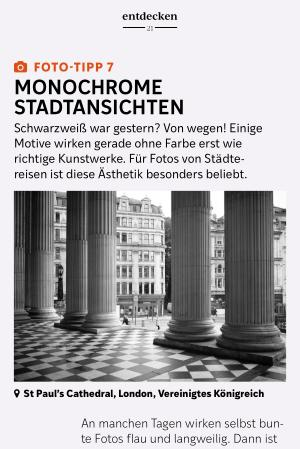 Schwarzweiß war gestern? Von wegen! Einige Motive wirken gerade ohne Farbe erst wie richtige Kunstwerke. Für Fotos von Städtereisen ist diese Ästhetik besonders beliebt.