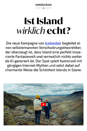 Die neue Kampagne von Icelandair begleitet einen selbsternannten Verschwörungstheoretiker, der überzeugt ist, dass Island eine perfekt inszenierte Fantasiewelt und vermutlich nichts weiter als KI-generiert ist. Der Spot spielt humorvoll mit gängigen Internet-Mythen und setzt dabei auf charmante Weise die Schönheit Islands in Szene.