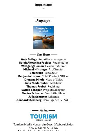 Die Redaktion behält sich die Kürzung und Bearbeitung von Beiträgen vor. Für unverlangt eingesandte Fotos, Manuskripte und Dateien wird keine Haftung übernommen. Das Recht zur Veröffentlichung wird grundsätzlich vorausgesetzt. Durch die Einsendung befreit der Absender den Verlag in jeglicher Weise von Ansprüchen Dritter. Alle in The Voyager veröffentlichten Text- und Bildbeiträge sind urheberrechtlich geschützt und dürfen nur mit schriftlicher Erlaubnis der Redaktion genutzt werden.