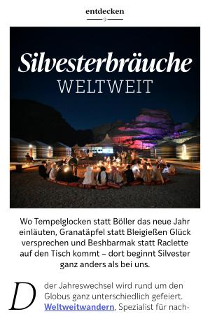 Lust, den Jahreswechsel einmal ganz anders zu erleben? Einige Weltweitwandern-Reisen finden genau zu Silvester statt – die Local Guides lassen sich zu diesem Anlass stets etwas Besonderes einfallen. So etwa auf der Jordanien-Reise „ Wüsten und die Felsenstadt Petra”: Hier wird der Jahreswechsel unter dem Sternenhimmel im Wüstental Wadi Rum zelebriert. „ Wir lieben es, diesen Moment zusammen mit unseren Gästen zu feiern“, erzählt Ahmad der Jordanien-Partner von Weltweitwandern. „ Am Lagerfeuer genießen wir traditionelle Beduinenmusik, erzählen Geschichten und heißen gemeinsam das neue Jahr willkommen.“