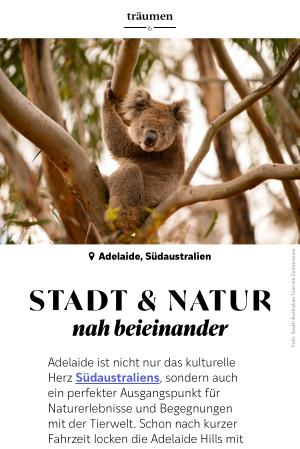 Adelaide ist nicht nur das kulturelle Herz Südaustraliens, sondern auch ein perfekter Ausgangspunkt für Naturerlebnisse und Begegnungen mit der Tierwelt. Schon nach kurzer Fahrzeit locken die Adelaide Hills mit idyllischen Weindörfern, Wanderwegen durch dichte Eukalyptuswälder und einer reichen Fauna – darunter Kängurus und Koalas, die immer wieder die Wege kreuzen oder sich beim Blick in die Bäume beobachten lassen. Wer Australiens Natur- und Tierwelt auf einen Schlag erleben möchte, sollte Kangaroo Island ansteuern. Nur eine kurze Auto- und Fährfahrt oder 30 Minuten Flugzeit von Adelaide entfernt sonnen sich Seelöwen an weißen Stränden, Kängurus und Wallabys ziehen durch die Landschaft, und im Flinders Chase Nationalpark thronen die Remarkable Rocks über dem Ozean. Auch die Flinders Ranges mit ihren markanten Outback-Landschaften sind von Adelaide gut erreichbar. So vereint Südaustralien pulsierende Stadt und unberührte Natur auf engstem Raum.